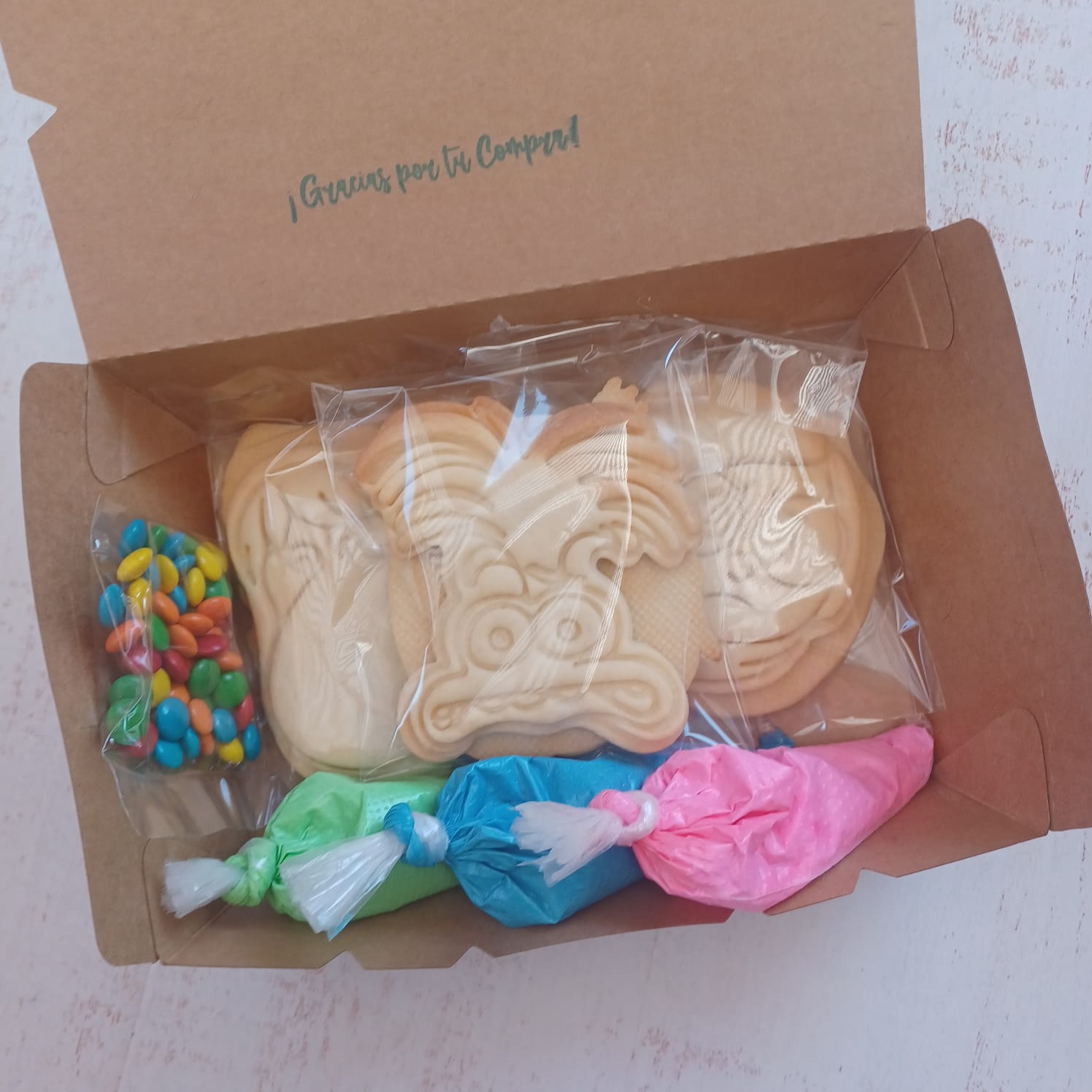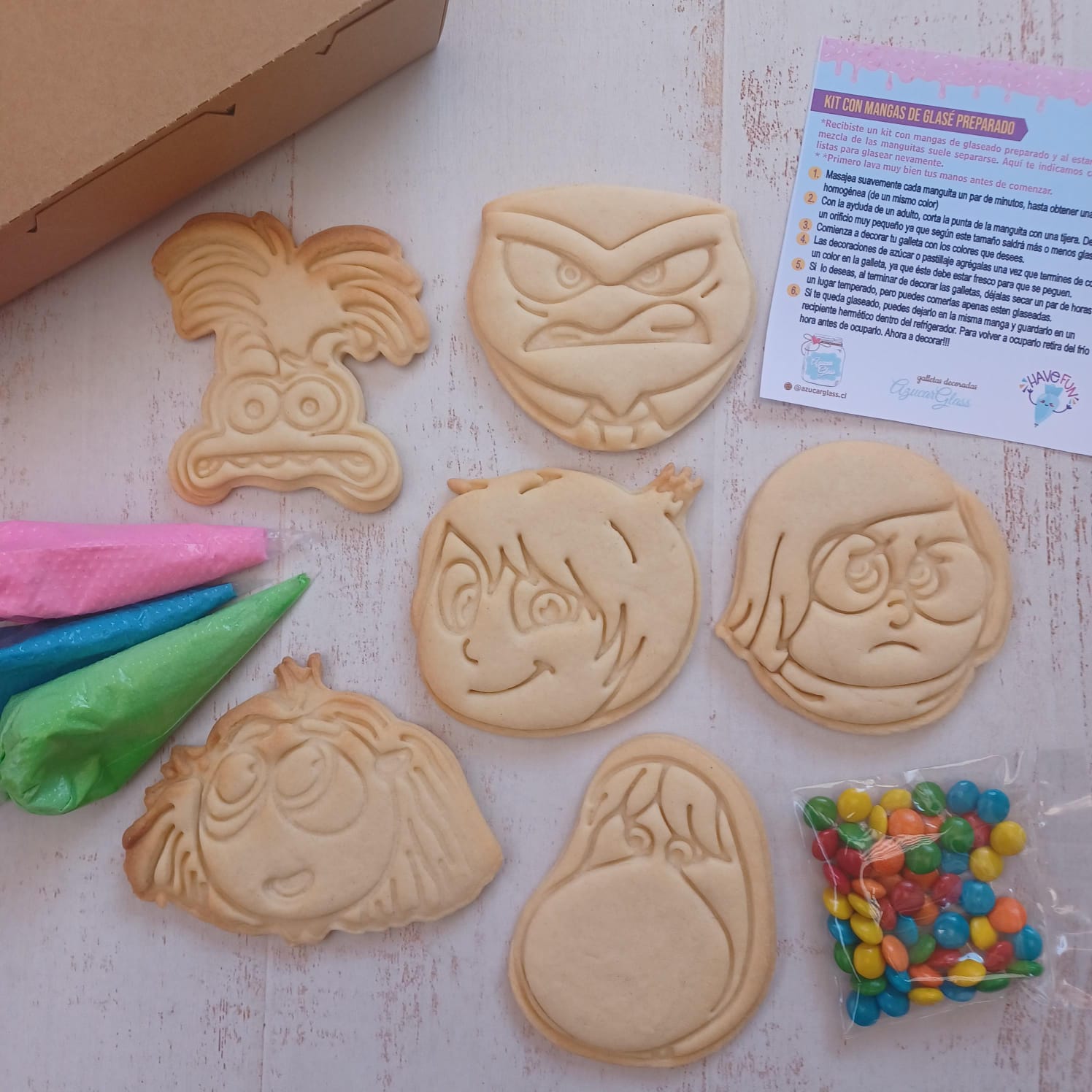¡Desata tu creatividad con nuestro Kit de Galletas Intensamente! Incluye 6 galletas para decorar con 6 diseños y 3 manguitas reposteras de glasé de colores para que puedas personalizar tus creaciones de manera única y divertida. Muy fáciles de usar y para toda la familia, perfecto para cumpleaños, fiestas o simplemente para disfrutar en familia.